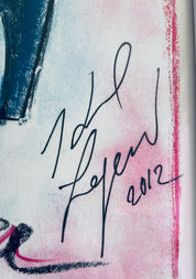 Like many fashion designers, he used sketches to illustrate his ideas to others, and left behind a substantial body of drawn work valued by collectors. The piece here is one of those drawings, a sketch for his collaboration with Melissa brand shoes of Brazil, released in 2013. This particular sketch was used in Elle Magazine’s first look of the shoe line and is signed by Lagerfeld himself, dated 2012.